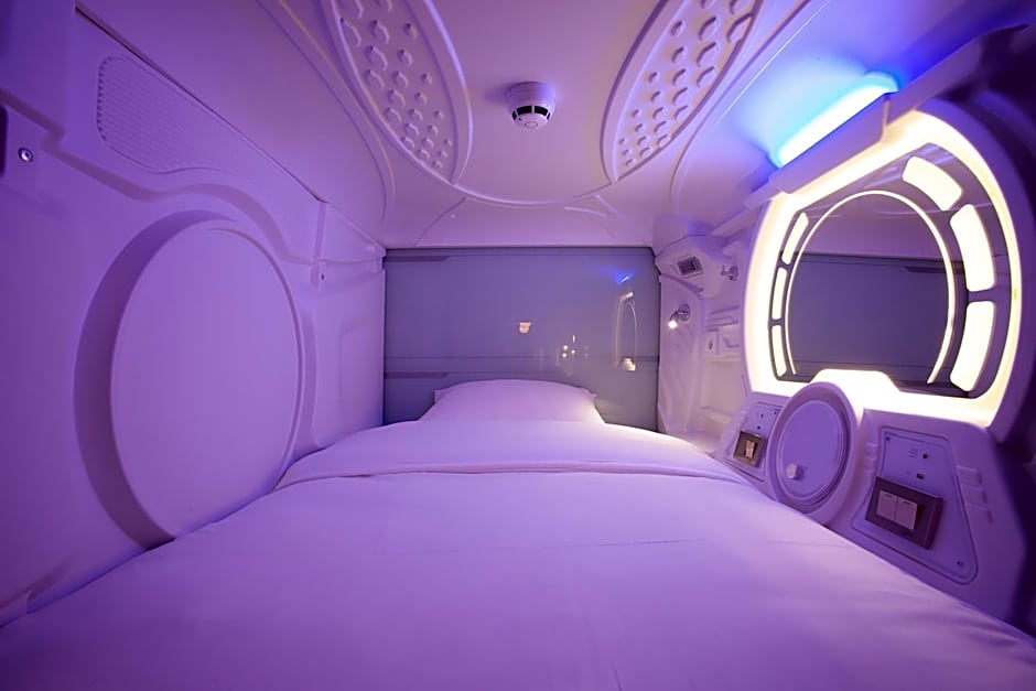 This Pod features air conditioning. Single pod in 31-pods mix room. All our Pods include a central control panel, light feature, cosmetic mirror, coat hook and charging station with USB port. The shared bathroom features a walk-in shower. Rooms on the upper floors are reachable by elevator.